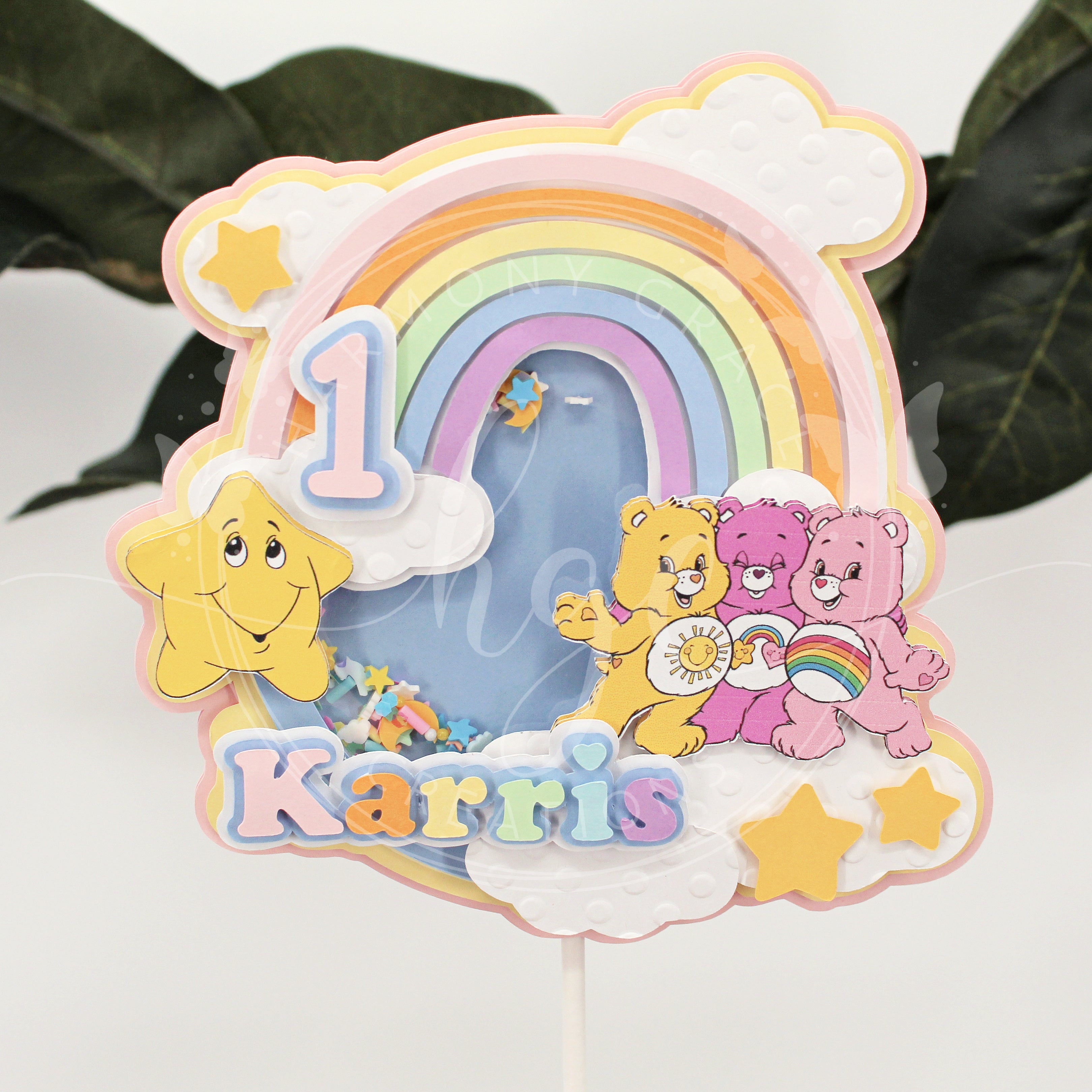 Rainbow friend's cardstock shaker cake topper with the child's name and age