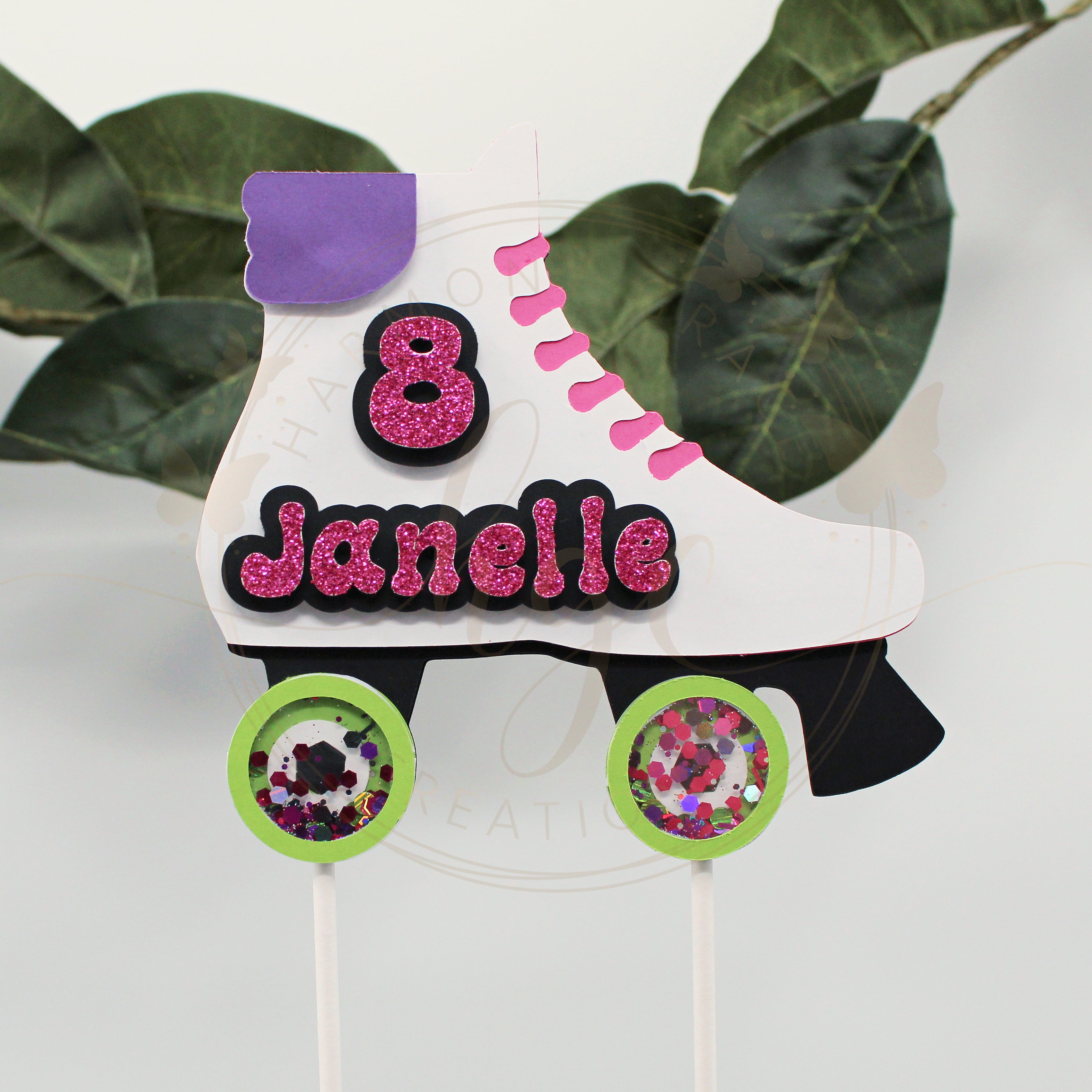 Roller skate cardstock shaker cake topper with the child's name and age